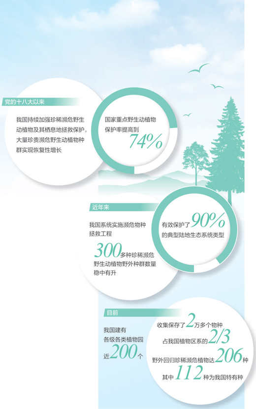 近年來,我國系統(tǒng)實施瀕危物種拯救工程,采取就地保護、遷地保護、放歸(回歸)自然、人工繁育(培植)等措施,有效保護了90%的典型陸地生態(tài)系統(tǒng)類型,300多種珍稀瀕危野生動植物野外種群數(shù)量穩(wěn)中有升。目前,我國建有各級各類植物園近200個,收集保存了2萬多個物種,占我國植物區(qū)系的2/3。野外回歸珍稀瀕危植物達到206種,其中112種為我國特有種。麋鹿、普氏野馬曾一度在野外消失,目前通過人工繁育等方式,總數(shù)分別達近1萬只和700只左右,并成功實施放歸自然,重新建立了野外種群,生存區(qū)域和范圍不斷擴大。