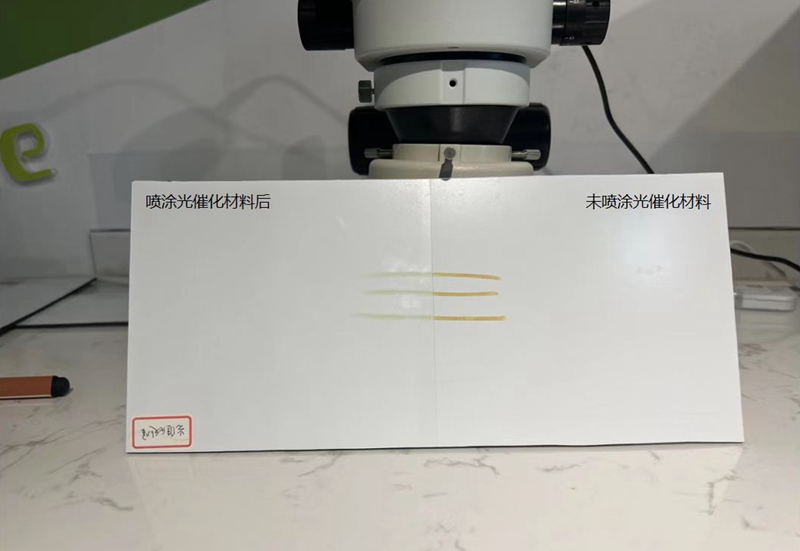 “將一塊鋁面板一分為二,一塊噴涂光催化涂膜,另一塊不噴涂。用有機(jī)染料筆模仿外界污染物,在兩塊材料表面標(biāo)記后,通過(guò)一分鐘紫外光燈照射,可看出噴涂了光催化涂膜的瓷磚鋁板部分染料降解效果明顯更高?!惫ぷ魅藛T告訴人民網(wǎng)浙江頻道,根據(jù)國(guó)家權(quán)威檢測(cè)機(jī)構(gòu)的實(shí)驗(yàn)證明,每噴涂1立方米的光催化涂膜,就能清除95%的甲醛。