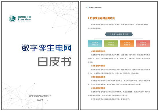 2021年7月,國網(wǎng)河北電科院聯(lián)合多家單位編制完成并發(fā)布了國內(nèi)電網(wǎng)領(lǐng)域首個《數(shù)字孿生電網(wǎng)白皮書》。白皮書歸納總結(jié)了雄安數(shù)字孿生建設(shè)成果,系統(tǒng)闡述了數(shù)字孿生電網(wǎng)的主要功能、體系架構(gòu)以及維護(hù)管理方式等內(nèi)容,創(chuàng)造性地提出了數(shù)字孿生電網(wǎng)的技術(shù)架構(gòu)和技術(shù)實現(xiàn)方式,對今后數(shù)字孿生技術(shù)在電網(wǎng)領(lǐng)域的探索應(yīng)用具有較強的指導(dǎo)意義。