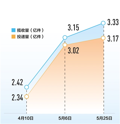 4月10日以來,各地各部門多措并舉保通保暢,全國停運(yùn)的郵政快遞分撥中心和郵件快件積壓數(shù)均大幅下降。5月6日,全國郵件快件攬收、投遞量均恢復(fù)至3億件以上;5月28日,郵件快件攬收量約為3.14億件,投遞量約為3.22億件,均超過去年同期水平。