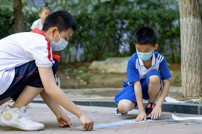 陶然亭街道大吉巷社區(qū)的一處核酸點(diǎn)位上,兩米線安全提示標(biāo)識引起大伙兒注意?!氨苊饩奂瑖?yán)防疫情”“綠色出行,愛心助考”“文明陪考,安全第一”……誰能想到這些醒目的標(biāo)語竟然是“陶然娃”們想的“愛心助考公約”?!榜R上就是高考了,希望哥哥姐姐們能取得好成績,不辜負(fù)自己多年的努力?!?3歲的陳博一趴在地上,奮力的拍了拍自己剛剛貼好的“公約宣傳條”。