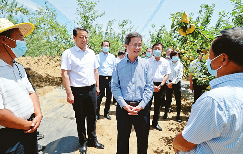 6月14日,省委副書記、省長、省總河長藍(lán)佛安來到吉縣柏山寺鄉(xiāng)“雙千畝”蘋果高新示范基地,與專業(yè)果樹種植戶親切交談,詳細(xì)了解基地建設(shè)及生產(chǎn)營銷開發(fā)等情況。 本報(bào)記者李兆民攝