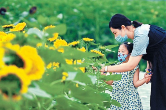 昨天,奧林匹克森林公園北園西門附近的“花田野趣”景區(qū),部分品種的向日葵競相綻放,吸引不少市民前來打卡拍照。 本報(bào)記者 程功攝