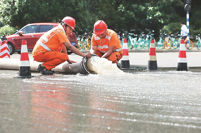 二十四日,南京市鼓樓區(qū)水務局工作人員在集賢路操作排水泵車清除積水,恢復道路正常通行。本報記者 陳儼 攝