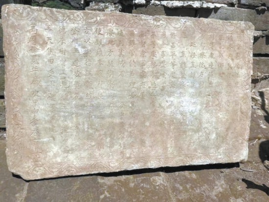 “發(fā)現(xiàn)一塊石碑,出土?xí)r碑文一面向下,推測這塊石碑原來鑲嵌在北側(cè)垛口墻內(nèi)側(cè),墻體傾斜倒塌后,石碑脫落?!表?xiàng)目考古負(fù)責(zé)人、北京考古研究院副研究員尚珩介紹。石碑為青石材質(zhì),保存完整,邊框刻著纏枝卷草紋。因?yàn)槊撀鋾r(shí)碑文面朝下,因此碑文保存完好,字體為繁體字,字跡娟秀,清晰可辨。