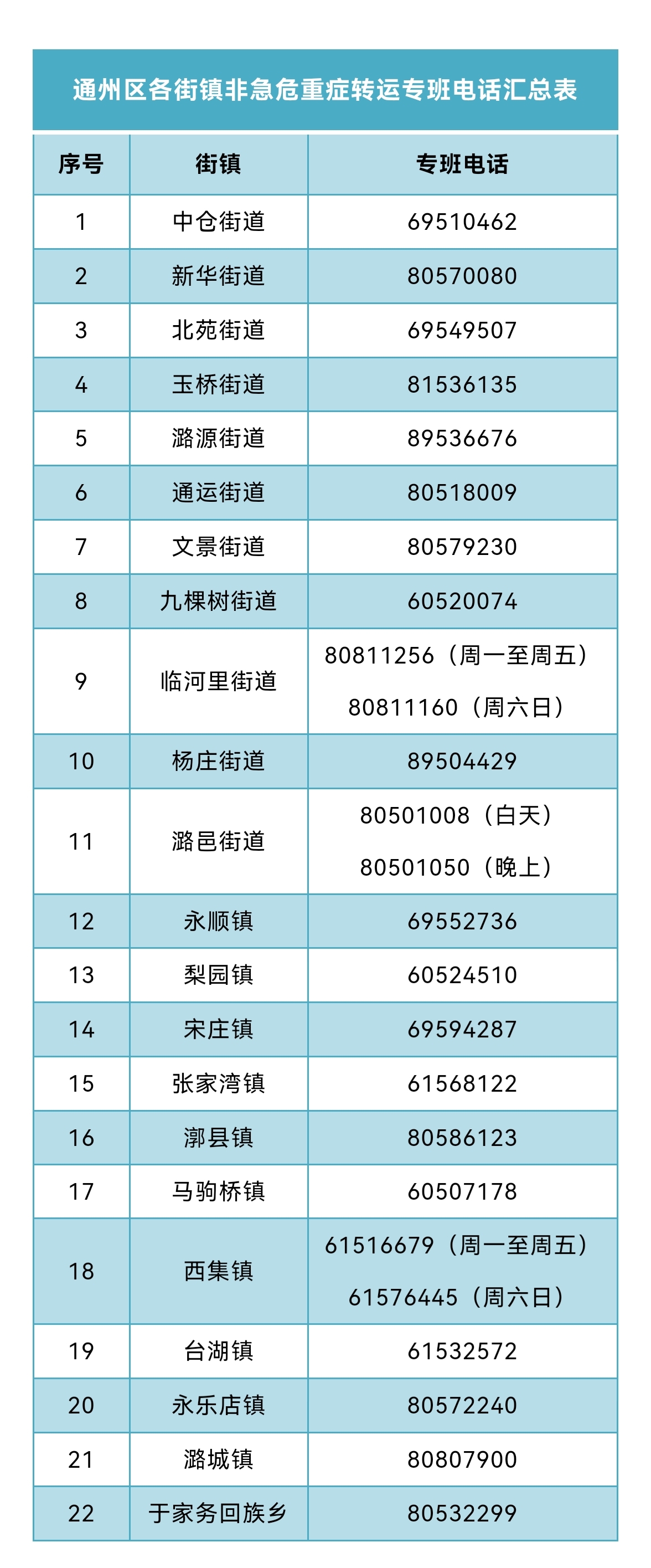 人民網(wǎng)北京12月21日電 為進(jìn)一步保障非急危重癥群眾就醫(yī)需求,不擠占120醫(yī)療急救資源,暢通就醫(yī)出行通道,將120救護(hù)車留給急危重癥患者,北京市通州區(qū)向社會(huì)公布各街道鄉(xiāng)鎮(zhèn)非急危重癥轉(zhuǎn)運(yùn)專班熱線電話(具體熱線電話見下表)。
