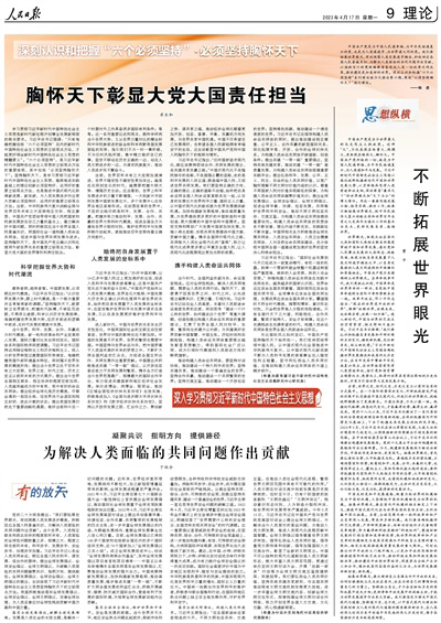 中國共產(chǎn)黨是為中國人民謀幸福、為中華民族謀復(fù)興的黨,也是為人類謀進(jìn)步、為世界謀大同的黨。我們要拓展世界眼光,深刻洞察人類發(fā)展進(jìn)步潮流,積極回應(yīng)各國人民普遍關(guān)切,為解決人類面臨的共同問題作出貢獻(xiàn),以海納百川的寬闊胸襟借鑒吸收人類一切優(yōu)秀文明成果,推動建設(shè)更加美好的世界。深刻認(rèn)識和把握“六個必須堅持”系列理論版今天推出第六期,圍繞“必須堅持胸懷天下”進(jìn)行闡述。
