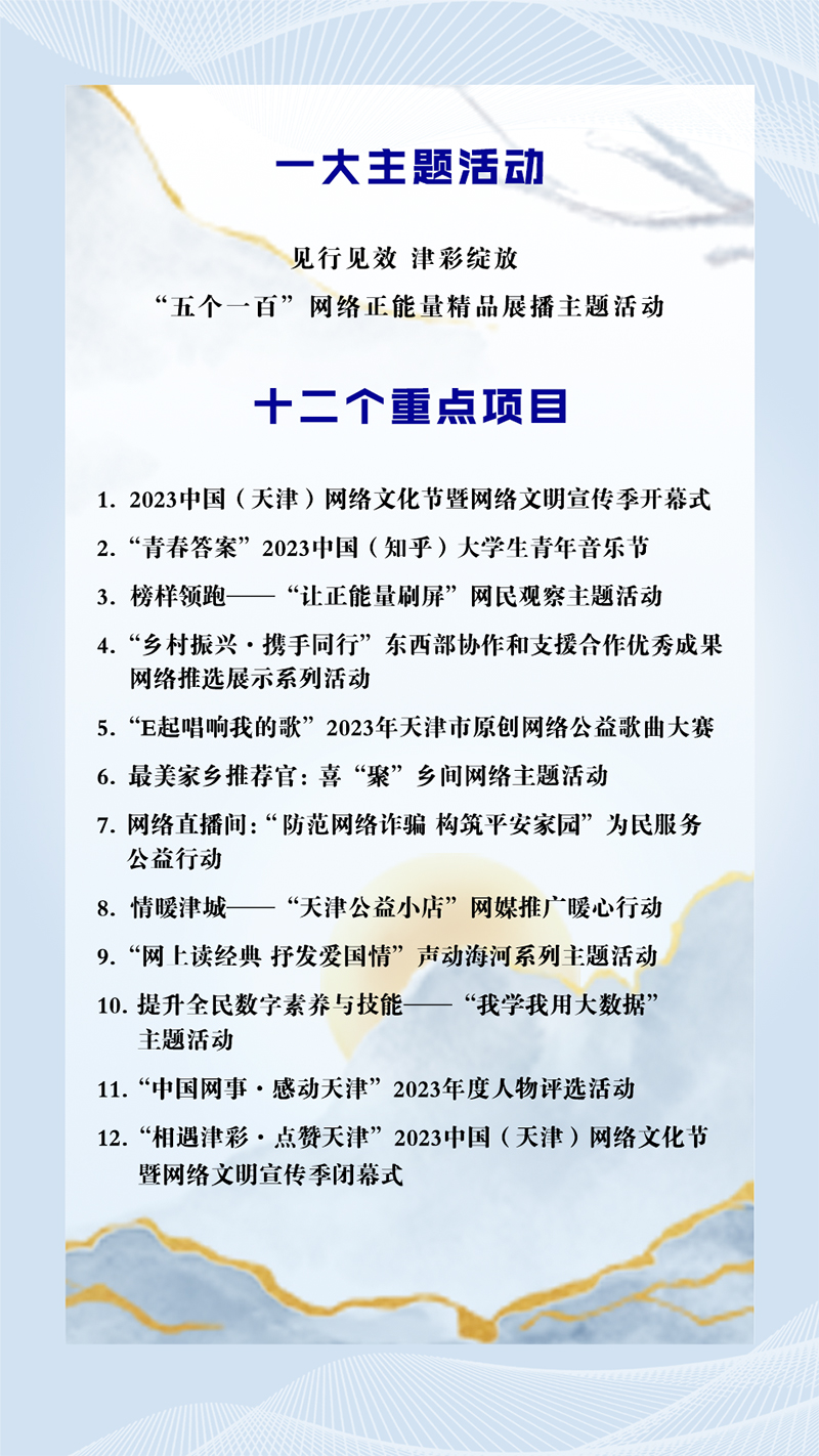 本屆網(wǎng)絡(luò)文化節(jié)旨在聚焦天津市委、市政府“十項行動”,推出時代感創(chuàng)新文化項目,打造年輕態(tài)靚麗文化品牌,展現(xiàn)廣大網(wǎng)民和人民群眾健康向上的幸福生活。
