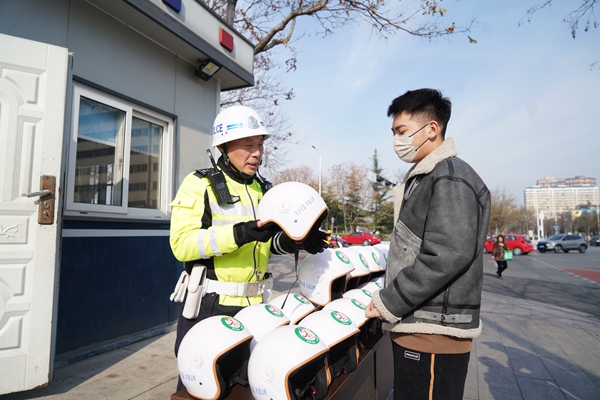 群眾在掃碼借用“共享頭盔”時(shí),系統(tǒng)自動(dòng)推送交通安全宣傳提示信息,實(shí)現(xiàn)借用一次頭盔、接受一次教育。(張晉 田廷江)