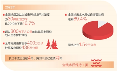 2023年,全國(guó)地級(jí)及以上城市PM2.5平均濃度為30微克/立方米,比2019年下降16.7%;全國(guó)地表水水質(zhì)優(yōu)良斷面比例達(dá)到89.4%,同比上升1.5個(gè)百分點(diǎn);超過300萬(wàn)平方公里的陸域國(guó)土面積劃入生態(tài)保護(hù)紅線。