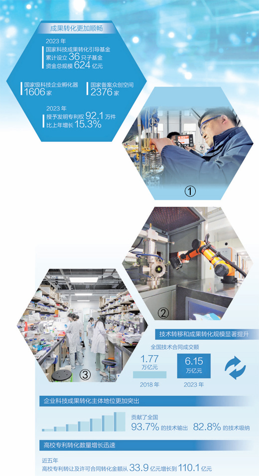印發(fā)《“十四五”技術要素市場專項規(guī)劃》,從健全科技成果產(chǎn)權制度、強化高質量科技成果供給等方面推動成果轉化;印發(fā)《專利轉化運用專項行動方案(2023—2025年)》,對專利轉化運用進行專門部署;制定《高校和科研機構存量專利盤活工作方案》,發(fā)揮市場和政府的協(xié)同作用,共同推動專利成果更好更快地轉化為現(xiàn)實生產(chǎn)力……近年來,一系列部署,一項項探索,讓創(chuàng)新鏈的好技術變成產(chǎn)業(yè)鏈的新應用,科技創(chuàng)新正在成為培育發(fā)展新質生產(chǎn)力的新動能。