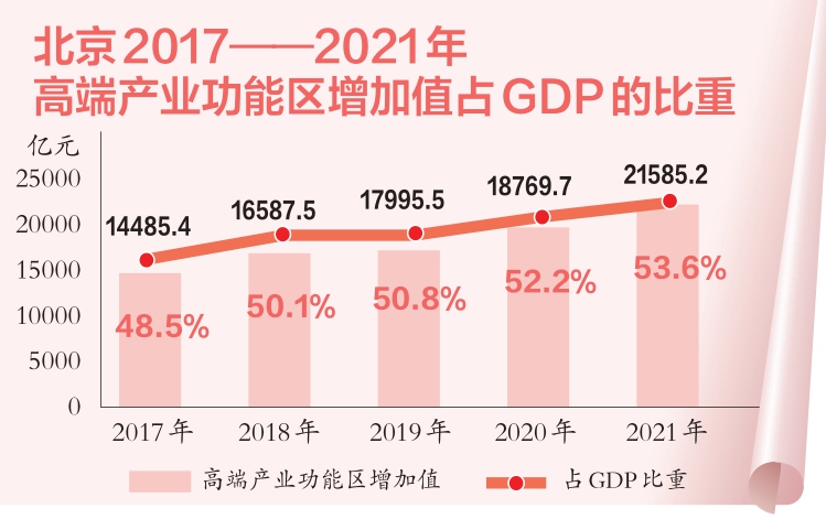 重點(diǎn)功能區(qū)呈現(xiàn)集聚效應(yīng)。中關(guān)村國(guó)家自主創(chuàng)新示范區(qū)等高端產(chǎn)業(yè)功能區(qū)占據(jù)全市經(jīng)濟(jì)總量的半壁江山,2021年實(shí)現(xiàn)增加值2.2萬(wàn)億元,占全市GDP的53.6%,比2016年提高5.3個(gè)百分點(diǎn)。