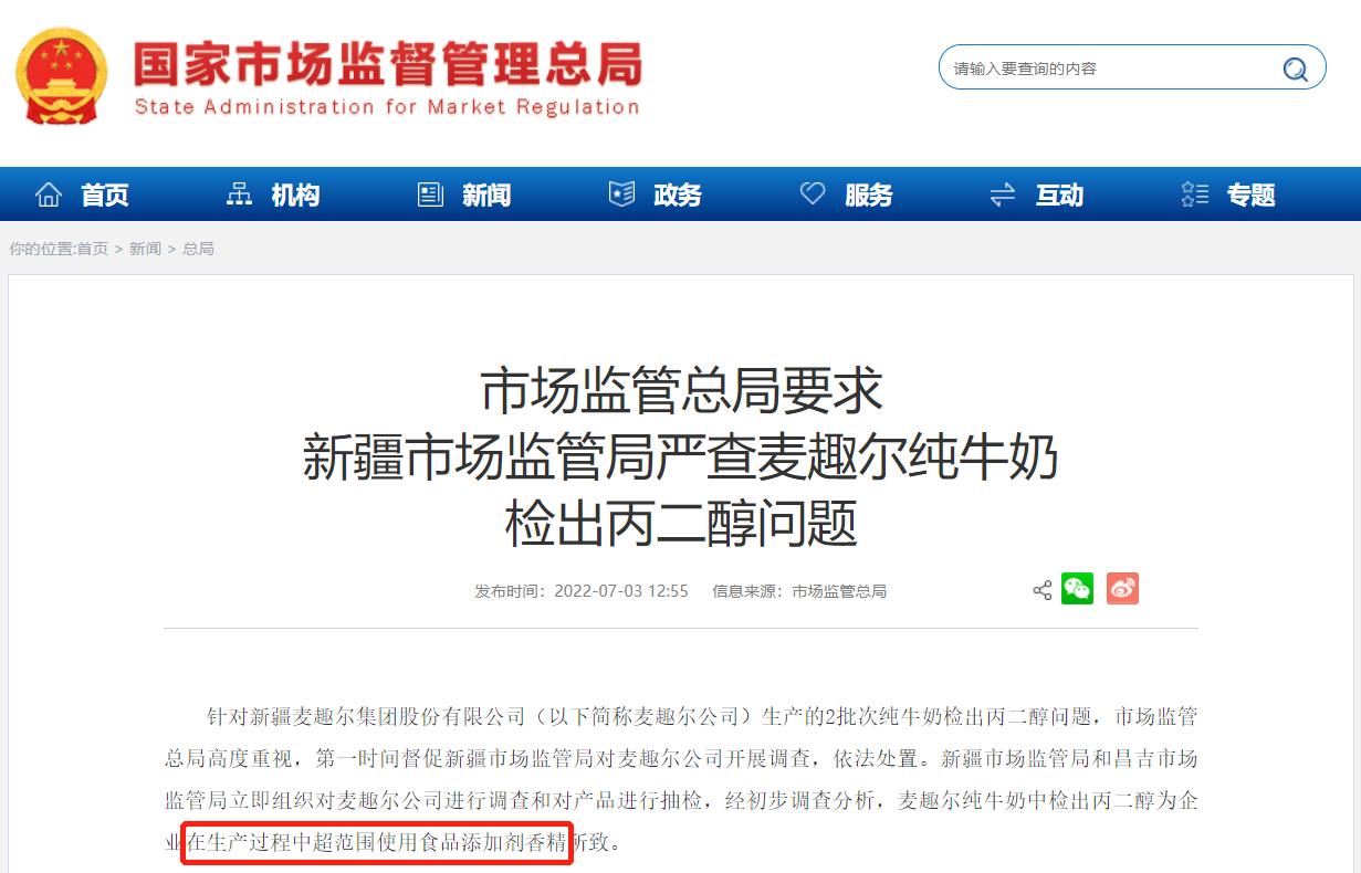 7月3日,國家市場監(jiān)管總局發(fā)布消息,要求“嚴查麥趣爾純牛奶檢出丙二醇問題”,并表示“經(jīng)初步調(diào)查分析,麥趣爾純牛奶中檢出丙二醇為企業(yè)在生產(chǎn)過程中超范圍使用食品添加劑香精所致?!?/p>