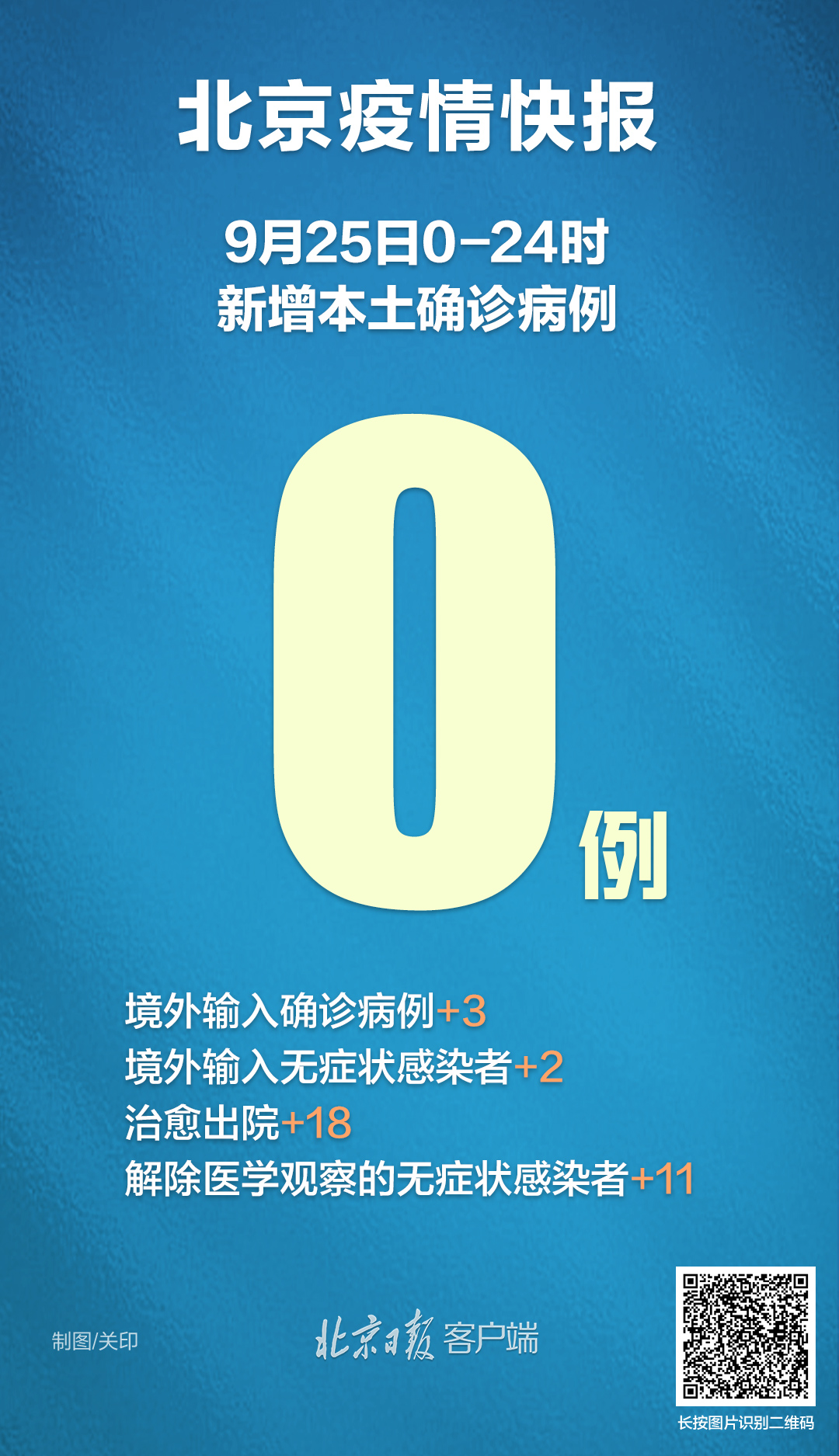 9月25日0時至24時,北京無新增本土確診病例、疑似病例和無癥狀感染者;新增3例境外輸入確診病例和2例無癥狀感染者,無新增疑似病例。治愈出院18例,解除醫(yī)學(xué)觀察的無癥狀感染者11例。