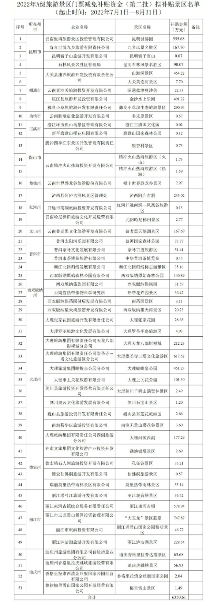云南省公布2022年A級旅游景區(qū)門票(第二批)擬補(bǔ)貼景區(qū)名單
