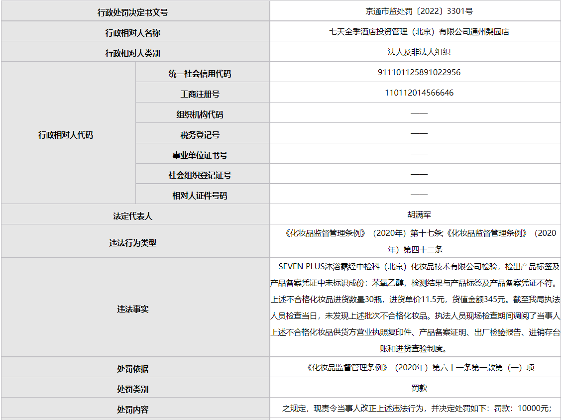 據(jù)文號為“京通市監(jiān)處罰〔2022〕3301號”行政處罰決定書顯示,七天酒店梨園店具體違法事實為:SEVEN PLUS沐浴露經(jīng)中檢科(北京)化妝品技術(shù)有限公司檢驗,檢出產(chǎn)品標(biāo)簽及產(chǎn)品備案憑證中未標(biāo)識成份:苯氧乙醇,檢測結(jié)果與產(chǎn)品標(biāo)簽及產(chǎn)品備案憑證不符。上述不合格化妝品進(jìn)貨數(shù)量30瓶,進(jìn)貨單價11.5元,貨值金額345元。