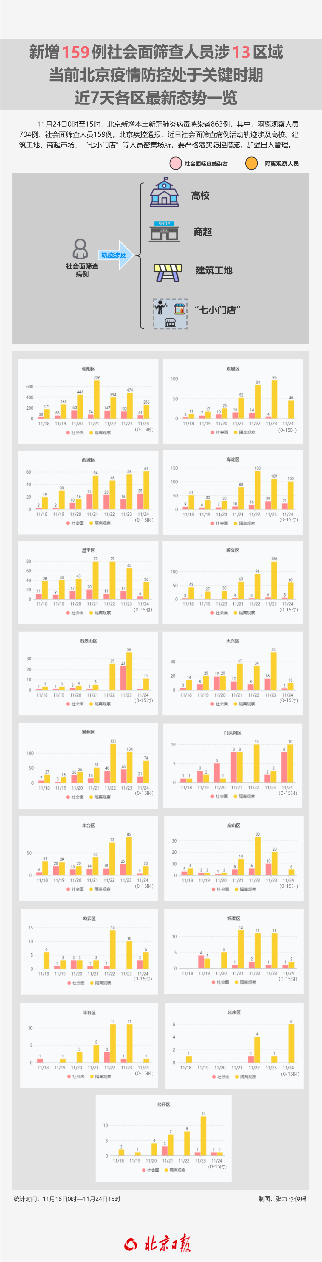 11月24日0時(shí)至15時(shí),北京新增本土新冠肺炎病毒感染者863例,其中,隔離觀察人員704例、社會(huì)面篩查人員159例;朝陽(yáng)區(qū)317例,海淀區(qū)121例,通州區(qū)95例,西城區(qū)86例,順義區(qū)65例,東城區(qū)45例,昌平區(qū)42例,豐臺(tái)區(qū)24例,門頭溝區(qū)18例,石景山區(qū)、大興區(qū)各12例,密云區(qū)9例,延慶區(qū)6例,房山區(qū)5例,懷柔區(qū)3例,經(jīng)開區(qū)2例,平谷區(qū)1例;重型3例、普通型2例、輕型164例、無(wú)癥狀感染者694例。