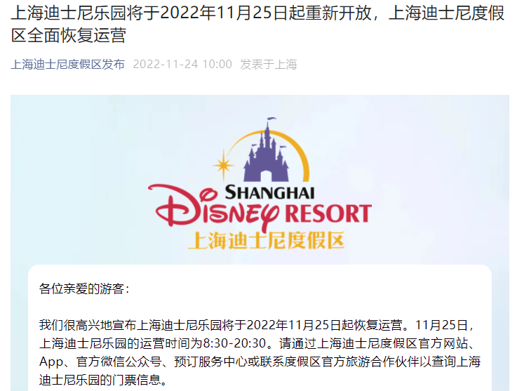 此外,迪士尼小鎮(zhèn)、星愿公園和上海迪士尼樂園酒店已于日前恢復運營。上海迪士尼樂園和玩具總動員酒店的重新開放標志著上海迪士尼度假區(qū)全面恢復運營。