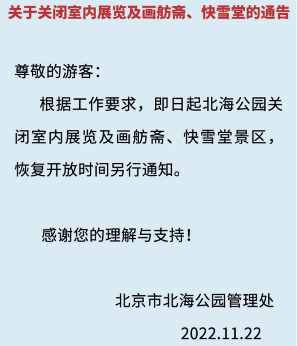 北京市北海公園管理處發(fā)布公告稱,根據(jù)工作要求,自11月22日起,北海公園關(guān)閉室內(nèi)展覽及畫舫齋、快雪堂景區(qū),恢復(fù)開放時間另行通知。