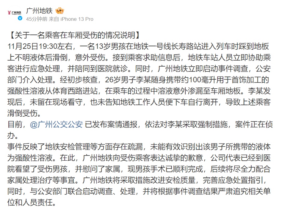 廣州地鐵方面表示,事件反映了地鐵安檢管理等方面存在疏漏,未能有效識別出該男子所攜帶的液體為強酸性溶液,向受傷乘客表達(dá)誠摯的歉意。廣州地鐵公司代表已經(jīng)到醫(yī)院看望了受傷男孩,并慰問了家屬,現(xiàn)男孩手術(shù)已順利完成,后續(xù)將盡全力配合家屬處理治療等事宜。