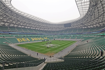 走進(jìn)新工體項(xiàng)目區(qū)域,清灰色外立面的工人體育場(chǎng)在陽光下熠熠生輝,綠茵賽場(chǎng)整裝待發(fā),看臺(tái)上環(huán)繞著寫有“北京國(guó)安”的綠色燈條。