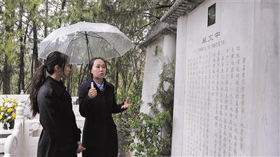 4月4日,周口店北京人遺址科學(xué)家紀(jì)念園,講解員劉博(右)向新京報(bào)記者講述考古學(xué)家的事跡。新京報(bào)記者 王巍 攝