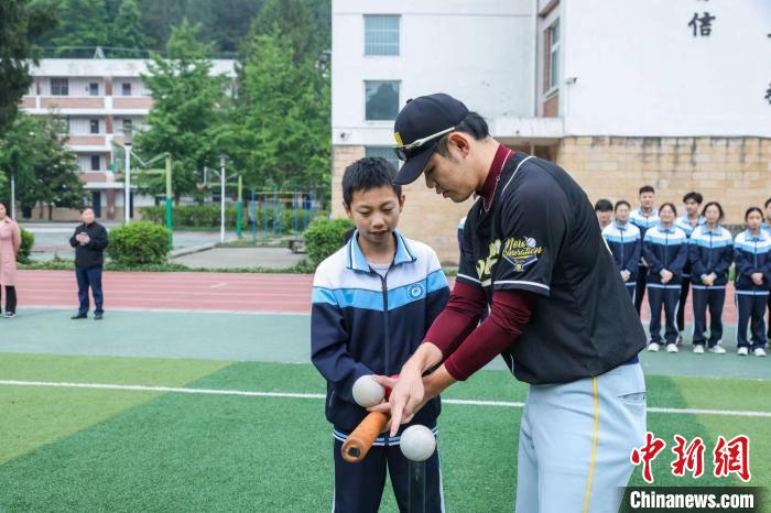 今年4月,臺(tái)青宋奇軒在北京合伙創(chuàng)辦“新世代棒球俱樂(lè)部”。圖為宋奇軒在四川省青川縣為當(dāng)?shù)貙W(xué)校開展公益棒球課項(xiàng)目。(受訪者供圖)