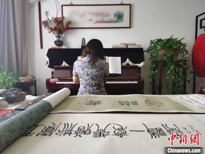 近日,楊玉如練完字后彈奏鋼琴。 中新社記者 鐘升 攝