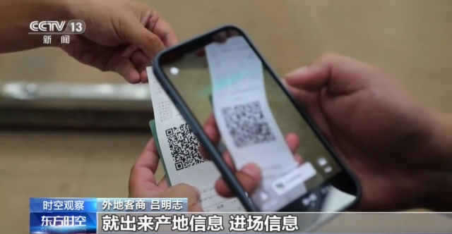 外地客商 呂明志:通過一卡通消費(fèi)了之后,掃上邊這個追溯碼,就出來產(chǎn)地信息、進(jìn)場信息、檢測信息,還有采摘時間,所以說現(xiàn)在很方便,比較安全。