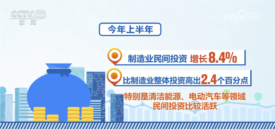 國(guó)家發(fā)展改革委相關(guān)負(fù)責(zé)人表示,當(dāng)前,民間投資結(jié)構(gòu)持續(xù)優(yōu)化,一些領(lǐng)域民間投資顯現(xiàn)了不少亮點(diǎn)。今年上半年,除房地產(chǎn)開(kāi)發(fā)以外的民間投資同比增長(zhǎng)9.4%,增速比全部投資高5.6個(gè)百分點(diǎn);制造業(yè)民間投資增長(zhǎng)8.4%,比制造業(yè)整體投資高出2.4個(gè)百分點(diǎn),特別是清潔能源、電動(dòng)汽車等領(lǐng)域民間投資比較活躍;基礎(chǔ)設(shè)施民間投資增長(zhǎng)15.6%,比基礎(chǔ)設(shè)施整體投資高出8.4個(gè)百分點(diǎn),呈現(xiàn)出較強(qiáng)的投資信心和投資動(dòng)力。