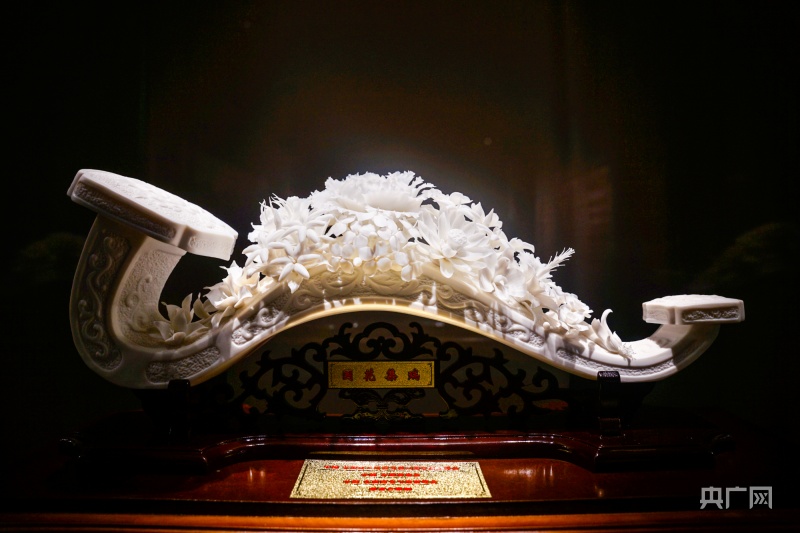 展出的德化白瓷作品《國(guó)花集瑞》(央廣網(wǎng)見(jiàn)習(xí)記者 李?yuàn)檴?攝)