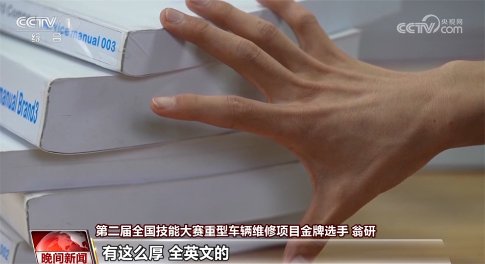 第二屆全國技能大賽重型車輛維修項(xiàng)目金牌選手 翁研:其實(shí)這次比賽的車型在一個(gè)月前才公布,而且全都是全新的車型,像我們比賽的資料(一個(gè)模塊)有2700多頁,這么厚,全英文的。