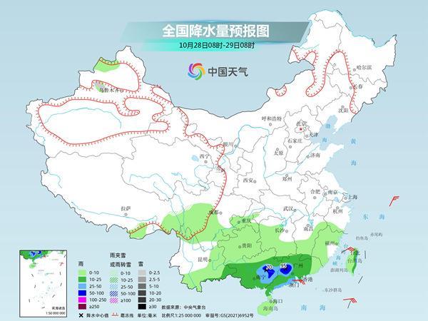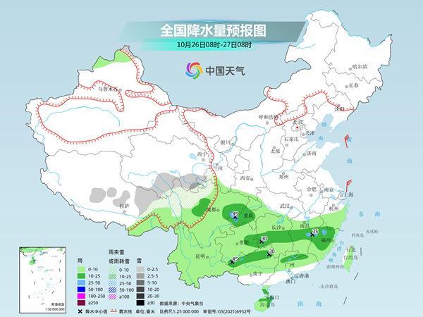 明天開始,降雨的重心將逐漸向華南轉(zhuǎn)移。預(yù)計(jì)新疆北疆北部、西藏東部等地部分地區(qū)有小到中雪或雨夾雪,局地大雪。西南地區(qū)大部、江南大部、華南等地有小到中雨,局地大雨。