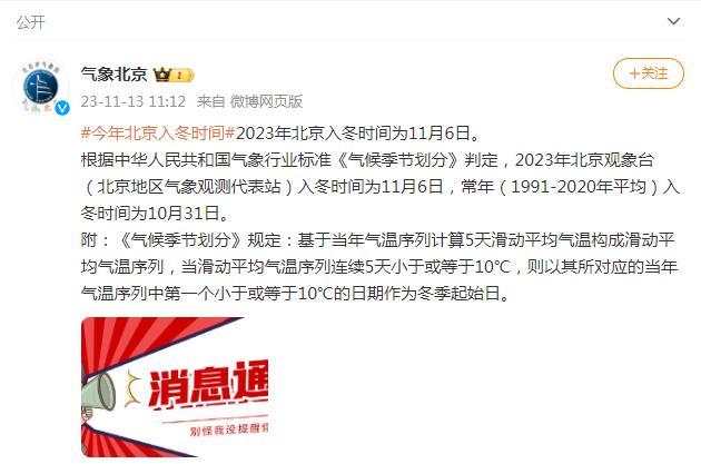 2023年北京入冬時間為11月6日