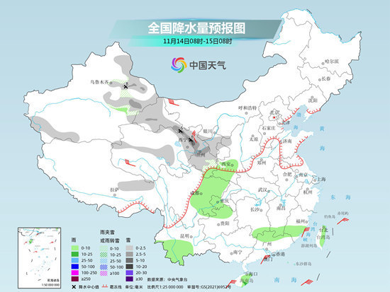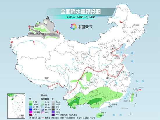 具體來(lái)看,今天,新疆北部等地部分地區(qū)有小雪或雨夾雪,局地有中到大雪。西南地區(qū)南部、江南南部、華南大部等地部分地區(qū)有小到中雨,局地有大雨。