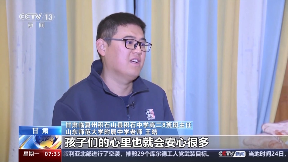 甘肅臨夏州積石山縣積石中學(xué)高二8班班主任、山東師范大學(xué)附屬中學(xué)老師 王晗:當(dāng)時(shí)著急的時(shí)候也沒有穿襪子,也沒有穿褲子,就穿了一條秋褲就出去了,就抓緊往學(xué)校跑,大約是15分鐘后我們就趕到了學(xué)校。在學(xué)生心目中,班主任在和班主任不在絕對是兩個(gè)樣,我往那一站,孩子們的心里也就會(huì)安心很多。當(dāng)然了孩子們都在,我心里也安心得多。