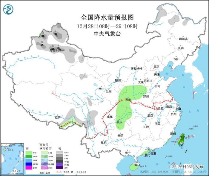 12月28日08時至29日08時,內蒙古東北部、黑龍江西北部、新疆北部、西藏東部等地部分地區(qū)有小雪或雨夾雪,其中,新疆北疆北部和沿天山地區(qū)等地部分地區(qū)有中到大雪(5~8毫米)。西北地區(qū)東部、華北南部、黃淮西部、西南地區(qū)東部、臺灣島等地部分地區(qū)有小到中雨,其中,臺灣島等地部分地區(qū)有大雨(25~40毫米)。青海西部部分地區(qū)有5~6級風(見圖3)。