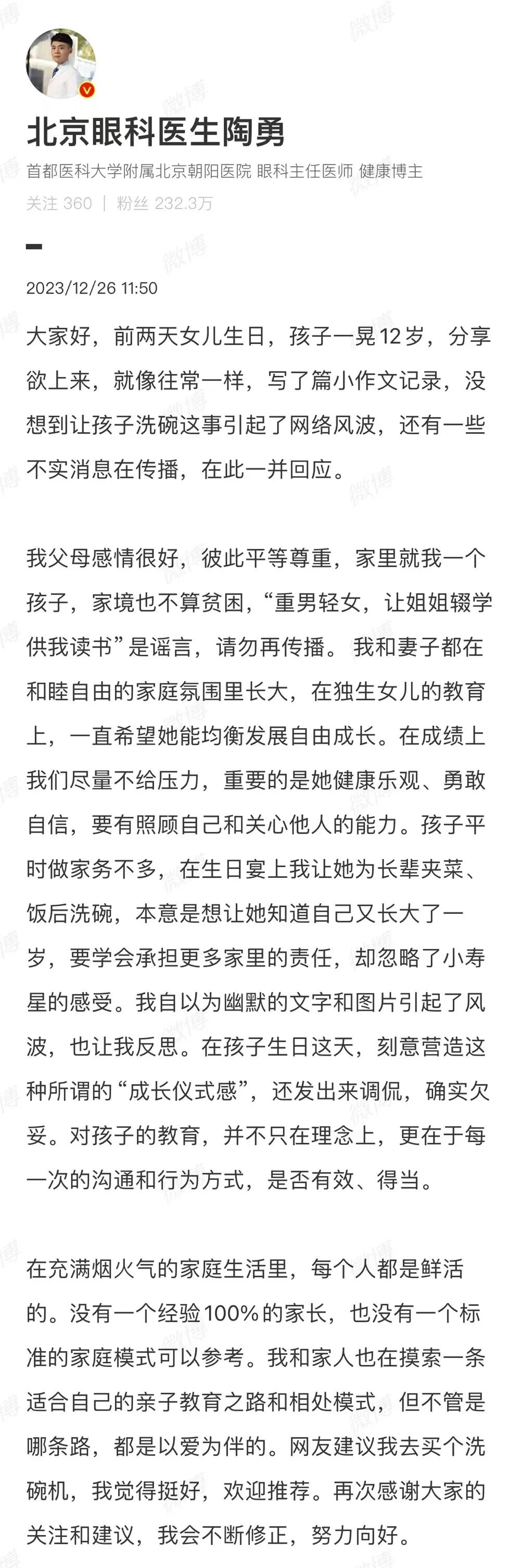 12月23日,陶勇醫(yī)生在微博分享了與12歲女兒的相處日常,文中講到生日這天,女兒拍照不配合。要求女兒在給長輩盛飯夾菜之后,陶勇還希望女兒可以洗碗。在家里人勸阻之后,陶勇還是說動女兒洗了碗。陶勇為此心里高興,于是發(fā)文分享此事。