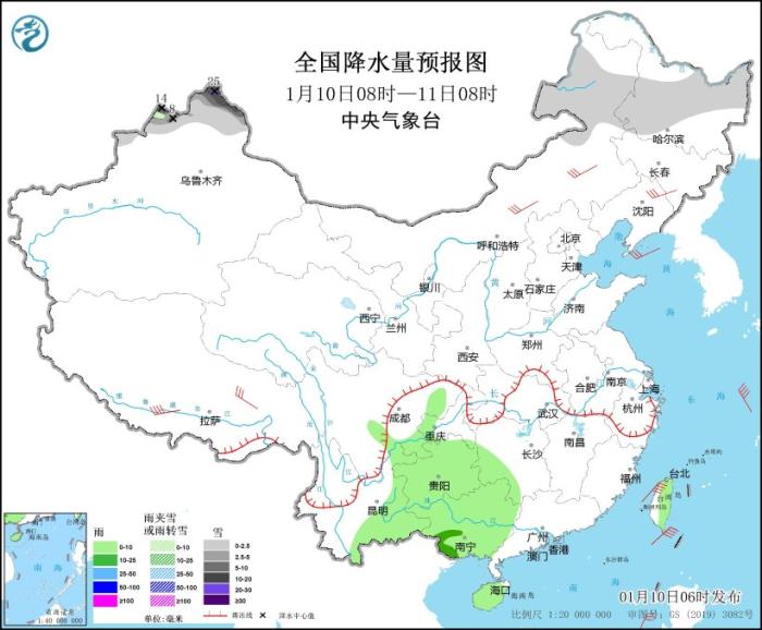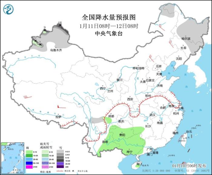 全國降水量預報圖(1月10日08時-11日08時)