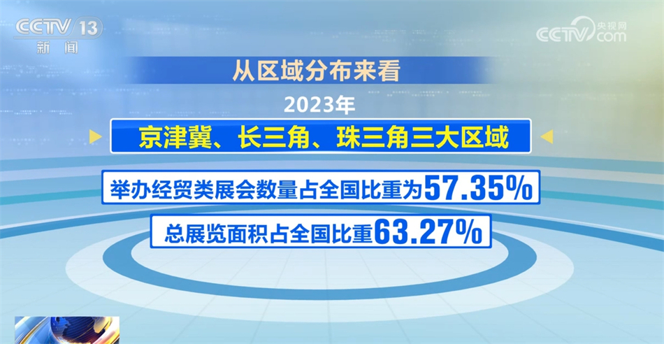 從區(qū)域分布來(lái)看,2023年京津冀、長(zhǎng)三角、珠三角三大區(qū)域舉辦經(jīng)貿(mào)類展會(huì)數(shù)量占全國(guó)比重為57.35%,總展覽面積占全國(guó)比重63.27%。
