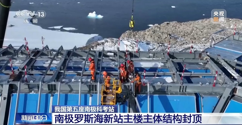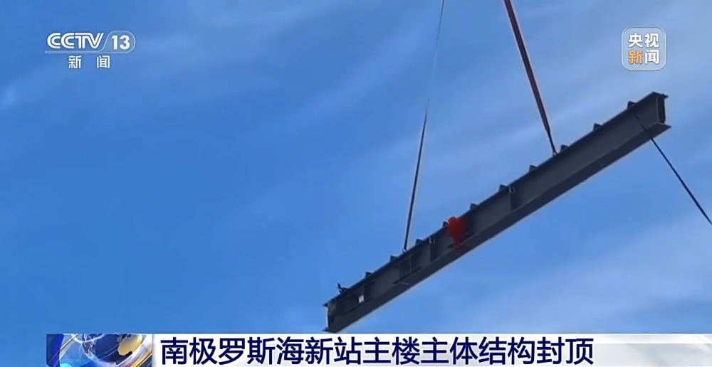 總臺央視記者 李寧:這里就是南極羅斯海新站的建設現(xiàn)場,現(xiàn)在正在進行吊裝作業(yè)的就是新站主樓的最后一根鋼梁。為了慶祝這個重要的工程節(jié)點,隊員們給這根鋼梁戴上了大紅花。隨著這根鋼梁的成功吊裝,標志著羅斯海新站的主樓主結(jié)構(gòu)完成了封頂。