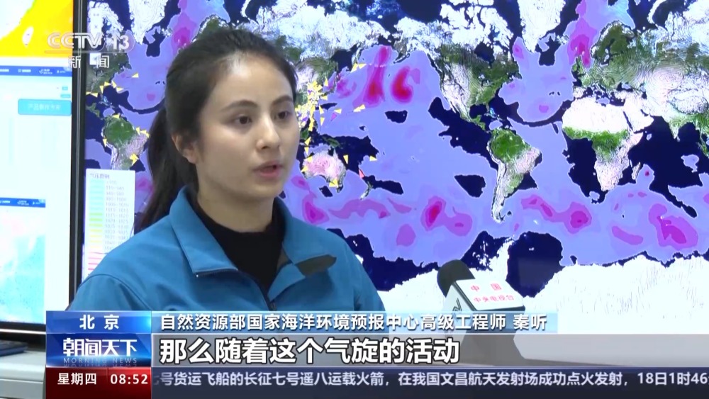 自然資源部國家海洋環(huán)境預(yù)報中心高級工程師 秦聽:那么隨著這個氣旋的活動,就會造成這種南半球的中低緯度的暖濕氣流,與南極的冷氣團(tuán)之間的碰撞,所形成的這種極地的降雪,以及海霧這種低能見度的一個情況,并且會引起它作業(yè)海區(qū)的一個大風(fēng)、海浪的這種高海況天氣。