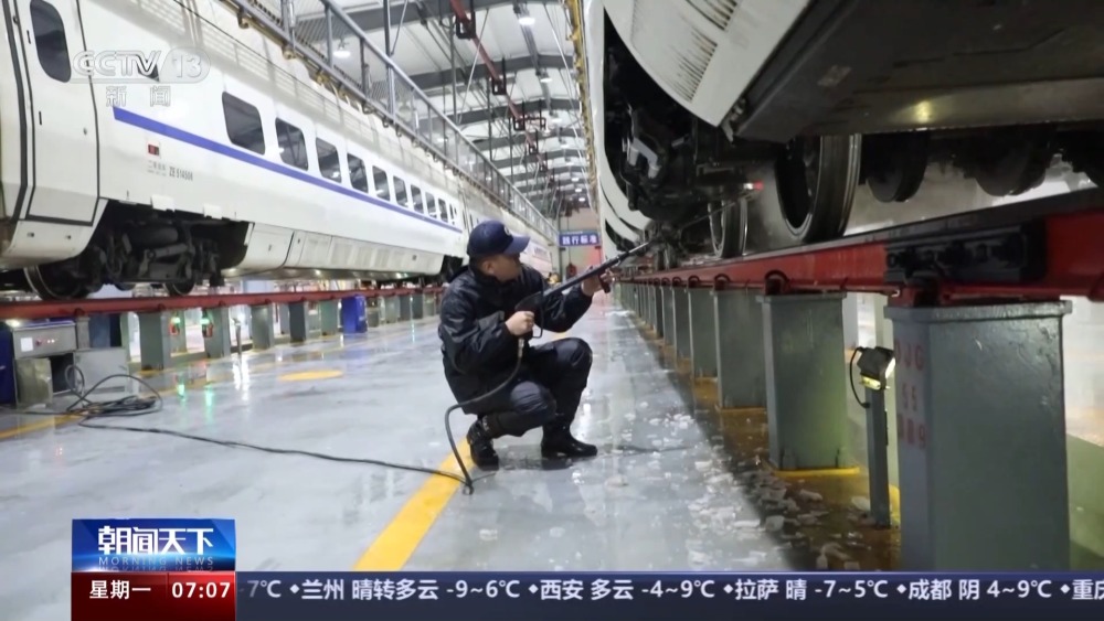 打開清冰除雪增壓裝置罩,連接噴水槍,按下電源鍵,調(diào)節(jié)水壓、溫度后,手握高壓噴水槍,開展對動車組轉(zhuǎn)向架進(jìn)行清冰除雪作業(yè)。周秀龍他們使用的已經(jīng)是第四代動車組融冰除雪裝置。