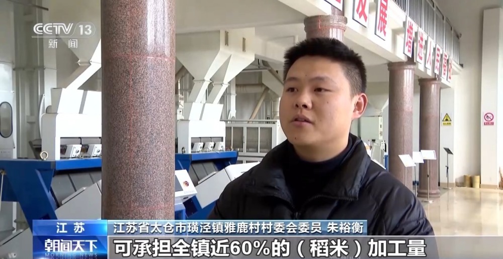 江蘇省太倉市璜涇鎮(zhèn)雅鹿村村委委員 朱裕衡:這個加工廠是由我們和隔壁的楊漕村、孟河村三個村一起投資建設的,可承擔全鎮(zhèn)近60%的(稻米)加工量,其他村都可以到這邊來加工,服務都是一樣的。