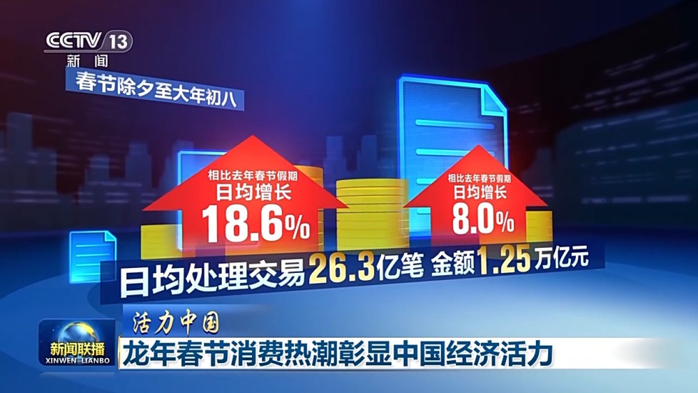 紅火的龍年春節(jié),折射出中國超大規(guī)模內(nèi)需市場潛力,也進一步激發(fā)中國經(jīng)濟向好的動力。國家稅務總局增值稅發(fā)票數(shù)據(jù)顯示,今年春節(jié)假期,全國服務消費相關行業(yè)日均銷售收入同比增長52.3%,消費,正持續(xù)發(fā)揮拉動經(jīng)濟增長的主引擎作用。