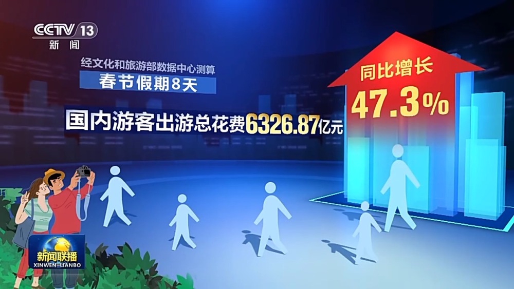今年這個春節(jié),人們走得更遠,游玩時間更長。出行平臺分析訂單數(shù)據(jù)后發(fā)現(xiàn),假期里,超過一半的人選擇跨省出游,其中三成以上的人選擇兩個及以上目的地,中國游客出境目的地覆蓋全球1700多個城市,個性化出游、定制化消費成為新趨勢。在陜西景區(qū)里看一場沉浸式演出,游客既是觀眾,又是演員,全新消費體驗帶來上億元演出收入;四川把火鍋文化和特色觀光結合在一起,帶動特色餐飲消費熱度不斷。節(jié)日里,滕王閣景區(qū)北園向公眾開放,通過濱江水道,游客可以直接穿行老城區(qū)的商鋪。經(jīng)文化和旅游部數(shù)據(jù)中心測算,春節(jié)假期八天,全國國內(nèi)旅游出游4.74億人次,同比增長34.3%,國內(nèi)游客出游總花費6326.87億元,同比增長47.3%。