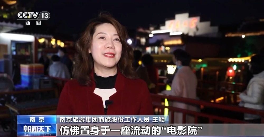 南京旅游集團商旅股份工作人員 王穎:每艘游船上都裝有GPS定位系統(tǒng),再配合沿岸的燈光、投影,讓游船在行駛途中仿佛置身于一座流動“電影院”,完整地貫通、復(fù)刻“十里秦淮”的歷史景象。