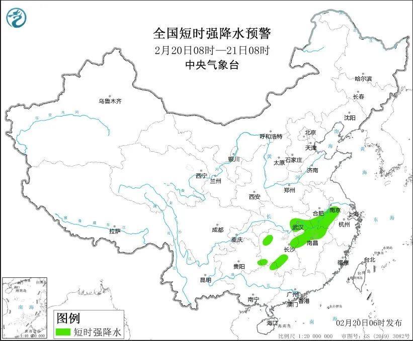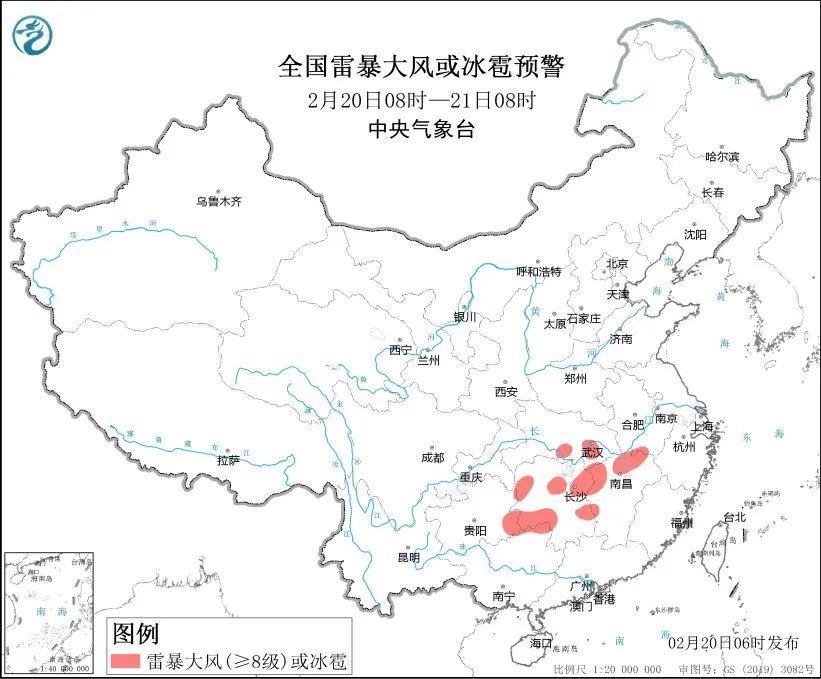 預(yù)計2月20日8時至21日8時,安徽西南部、湖北東部和南部、湖南中北部和西南部、江西中北部、貴州東南部、廣西東北部等地的局地將有8至10級雷暴大風(fēng)或冰雹天氣;安徽中南部、江蘇西南部、湖北東部、湖南南部和西部、江西北部、廣西東北部等地的部分地區(qū)將有短時強降水天氣,最大小時雨量20至30毫米,局地可達35毫米以上。