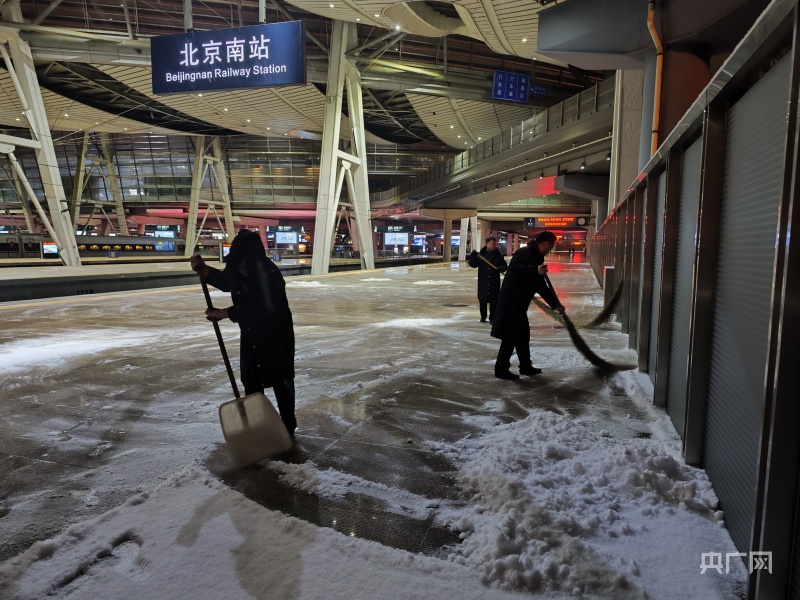 北京南站第一時(shí)間啟動(dòng)預(yù)警和應(yīng)急響應(yīng),組織除雪突擊隊(duì)及時(shí)清掃站臺(tái)等處的積雪,確保旅客乘降安全。