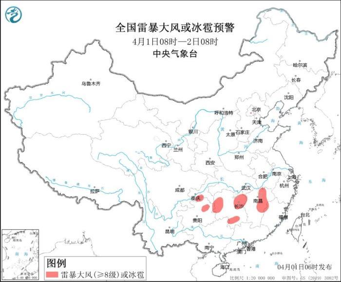 全國雷暴大風(fēng)或冰雹預(yù)警(4月1日08時(shí)-2日08時(shí))